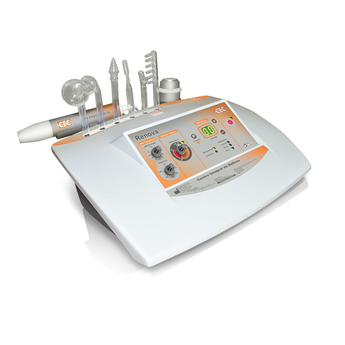 Renova es un equipo multiterapia para tratamientos faciales, capilares y dermatológicos. Trabaja con Alta Frecuencia, Termoterapia, Corriente Galvánica, Microcorrientes y Electroestimulación. Provisto de 6 bulbos para alta frecuencia, 1 cabezal térmico, 2 electrodos puntales (electroestimulación / lifting), y 1 electrodo facial. La terapia: alta Frecuencia: máximo rendimiento en tratamientos con finalidades cicatrizantes, descongestivas y de oxigenación celular. Aplicaciones: Fotoenvejecimiento de la piel, corrección de finas líneas de expresión y arrugas; acné, congestiones, cicatrices, reducción de tejido adiposo facial, flacidez, pieles secas o muy grasas, manifestaciones cutáneas del estrés, manifestaciones edematosas y caída de cabello. Provisto de: ·Timer digital. ·6 bulbos para alta frecuencia. ·1 cabezal térmico. ·2 electrodos puntales (electroestimulación / lifting). ·1 electrodo facial. ·1 Electrodo 65 mm. ·Regulación manual de todos los parámetros.