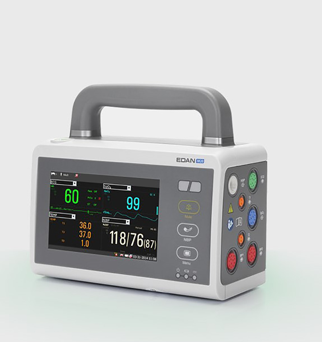 Monitor multiparamétrico de transporte. Diseñado especificamente como monitor de trasporte, el iM20 cuenta con: ·Protección contra agua y polvo grado IP44 ·Resistencia de choque de 1.2 mts a caídas e impactos ·Resistente a temperaturas extremas ·Pantalla touch screen TFT color de 5” ·Memoria incorporada 256M ·Batería interna recargable 4hs duración ·Conexión WIFI incluida. ·Comunicación bidireccional ·ECG de 3 o 5 derivaciones, Respiración, Spo2, 2 Temp, NIBP ·Análisis de arritmias. Segmento S·T ·Frecuencia cardíaca. Rango: Adultos 15·300 bpm, neonatos 15·350 bpm. ·Frecuencia respiratoria. Método: impedancia R·F, (RA·LL), R·L, RA·LA. Rangos: adultos 0·120 rpm, niños/neonatos 0·150 rpm. ·Detección de APNEA, con alarma. ·Detección de marcapasos ·Aprueba de interferencia de electrobisturí ·Función OxyCRG para aplicación en neonatos. ·Detección de segmento ST ·Presión arterial no invasiva. 3 modos: Manual/Automática/Continua ·Temperatura 2 canales con valores en pantalla en grados