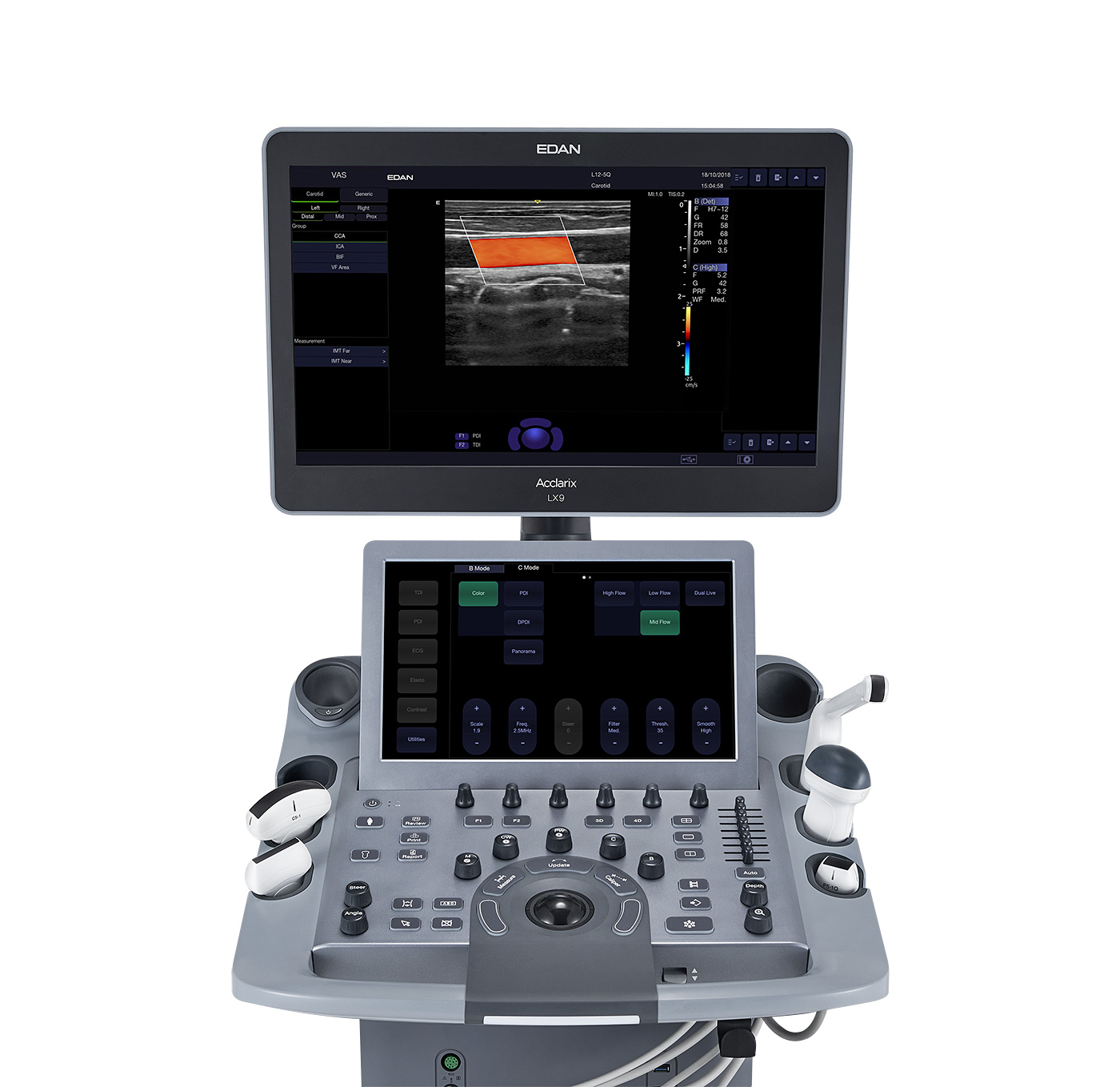 Elegante fusión de especialidad y flexibilidad Desarrollado específicamente para hacer frente a los retos de los complejos entornos de ecografía, el sistema de ultrasonido de diagnóstico Acclarix LX9 tiene como objetivo proporcionar un diagnóstico preciso en una clínica versátil con una calidad de imagen sin concesiones, un flujo de trabajo brillante y un funcionamiento sencillo. Diseño ergonómico 1.Teclado retráctil con iluminación descendente dirigida 2.Diseño de calentador de gel humanizado 3.Pantalla táctil inclinable de 14 pulgadas 4.Monitor LCD de alta resolución de 21,5 pulgadas 5.Panel de control giratorio y ajustable en altura 5.Cinco tomas de transductores disponibles