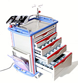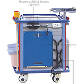 Carro de reanimación F·46 ·Construido en plástico de alto impacto. ·Diseñado para atención de emergencia. ·Sistema de cierre centralizado y de fácil cierre y apertura. ·Soporte porta suero extensible. ·Soporte para tanque de oxígeno ·Contenedores de basura ·Bandeja giratoria para desfibrilador o monitor. ·Cajones totalmente extraíbles para fácil acceso y limpieza. ·Una tabla para masajes cardíacos ·Ruedas de 13mm con frenos. ·Dimensiones: largo 850 x ancho 520 x altura 1045mm